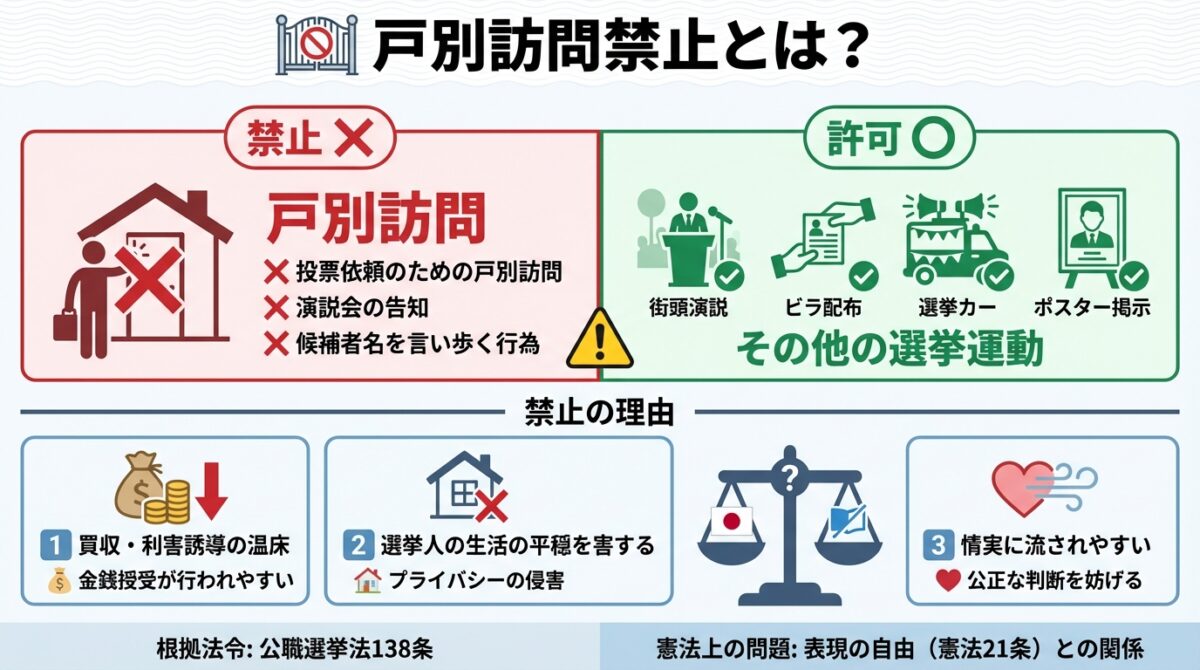 公職選挙法138条により選挙運動における戸別訪問は禁止されています。