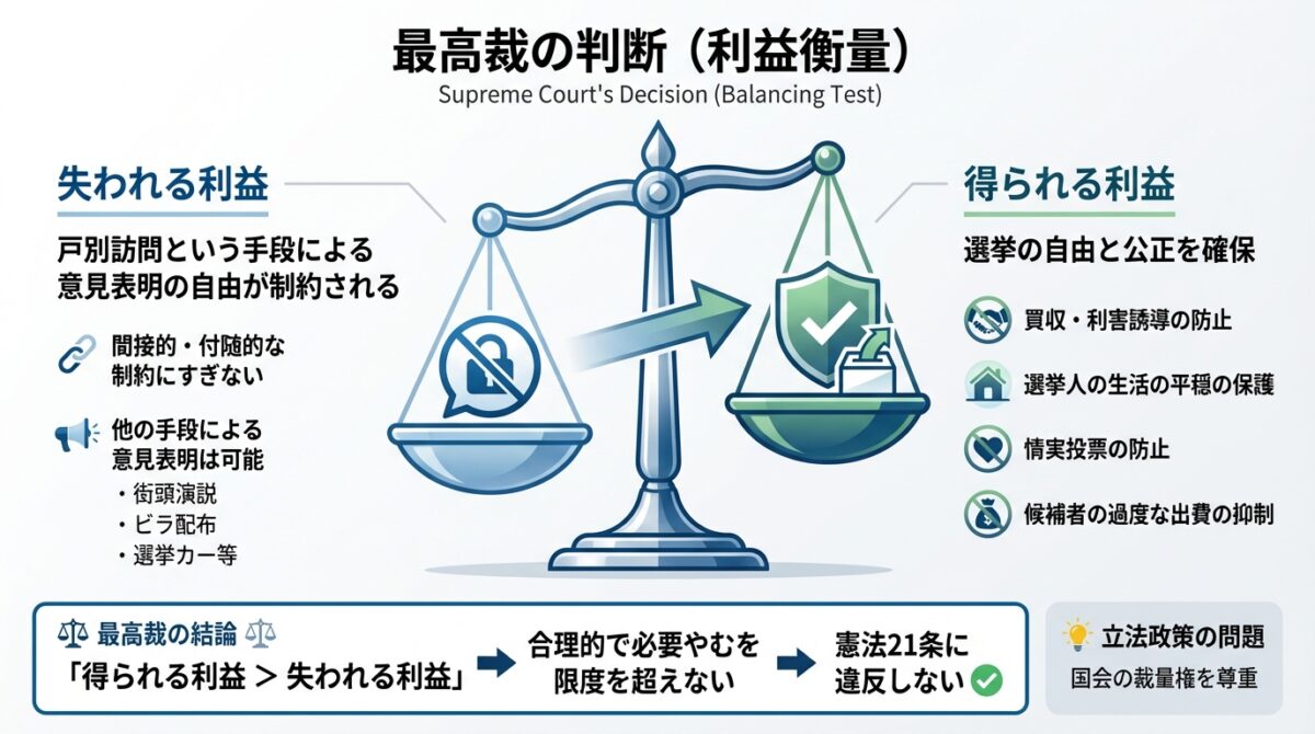 最高裁は、選挙運動における「戸別訪問」を禁止する規定について、比較衡量論を持ち出したうえで合憲と判断しました。
