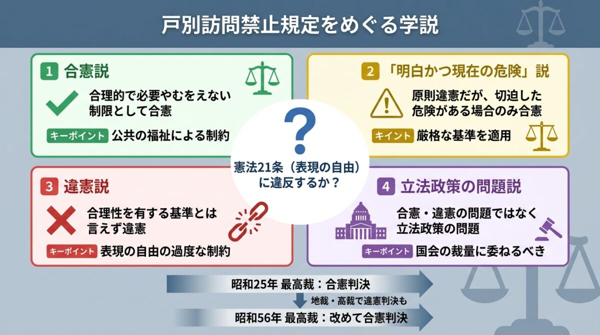 戸別訪問禁止規定が合憲か違憲かについては様々な学説がありますが、主な学説は次のとおりです。