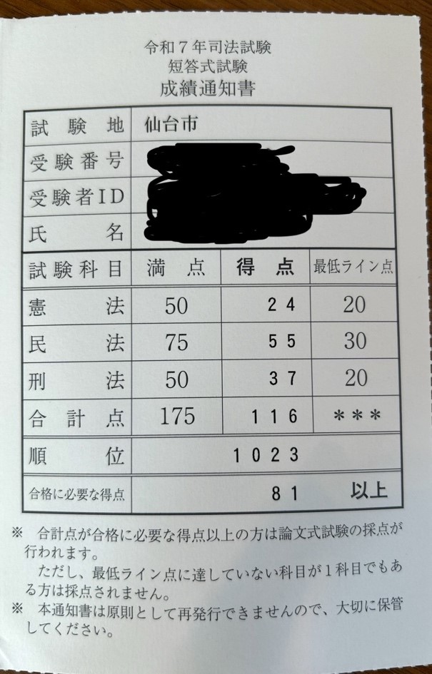 そこで、短答対策は6月に入るまでに終わらせて、司法試験短答式試験の前日にざっと自作メモを見返す以外はしませんでした。しかし、合格者平均点を超えていたことからすれば抑えるべきことを抑えていれば日にちが経とうと安定した点数を取れることの証左となったと思います。