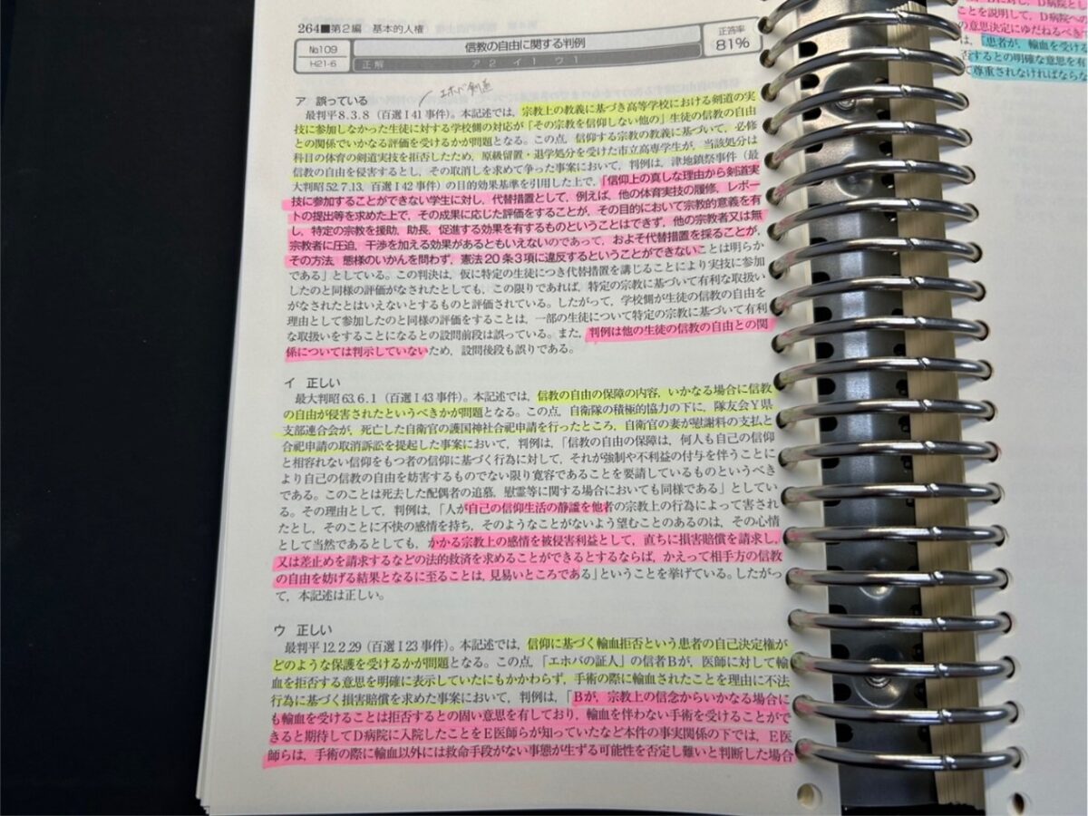 問題を見て分からなければすぐ解説を見て複数の問題に使用されている判例があれば判例百選を読むといった方法で使用し、また、問題提起、判旨、理由付けなど色を変えて読み返したときに視覚的にわかりやすくすることを心がけていました。
