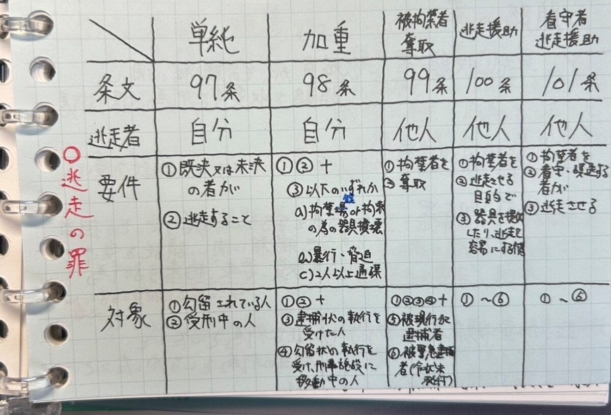 例えば、刑法であれば逃走の罪などは、全ての類型について一元化した表を作成しました。時間がない場合などはそのメモをぱらっと見返すくらいしかしませんでした。短答に関しては、あまり暗記の時間を設けませんでした。暗記したのは、担保の順位や、相続分の計算方法くらいです。
