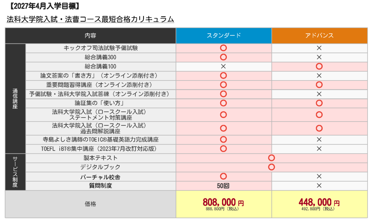 ・法科大学院入試・法曹コース最短合格カリキュラム スタンダードとアドバンス