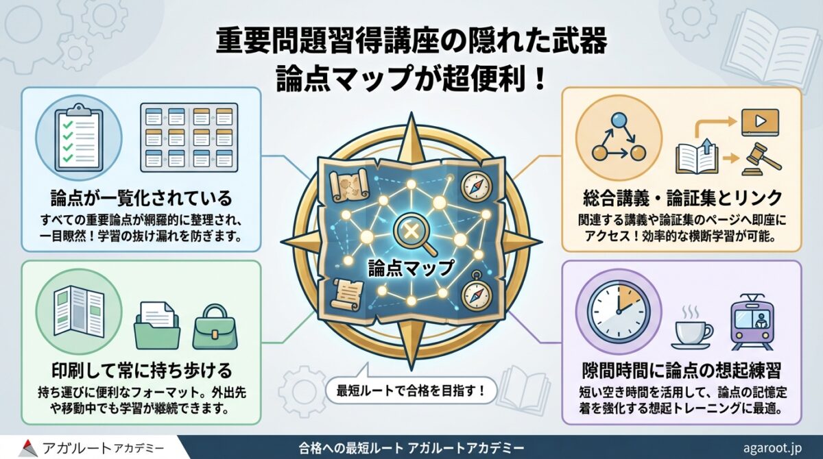 今回は、アガルートの三種の神器の中の一つの「重要問題習得講座」に焦点を当てて解説をさせて頂きます。