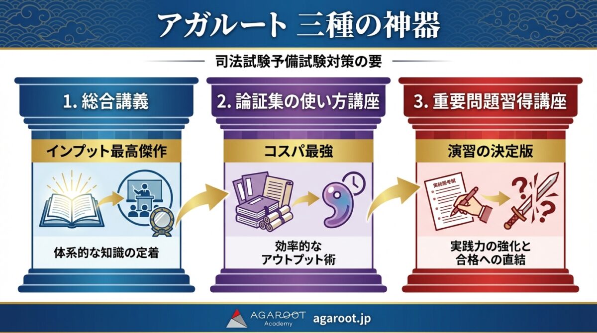 アガルートの三種の神器」とは、当サイト勝手に超絶お勧めしている①総合講義、②論証集の使い方講座、③重要問題習得講座のことだよ。少し先で詳しく説明しているよ!
